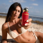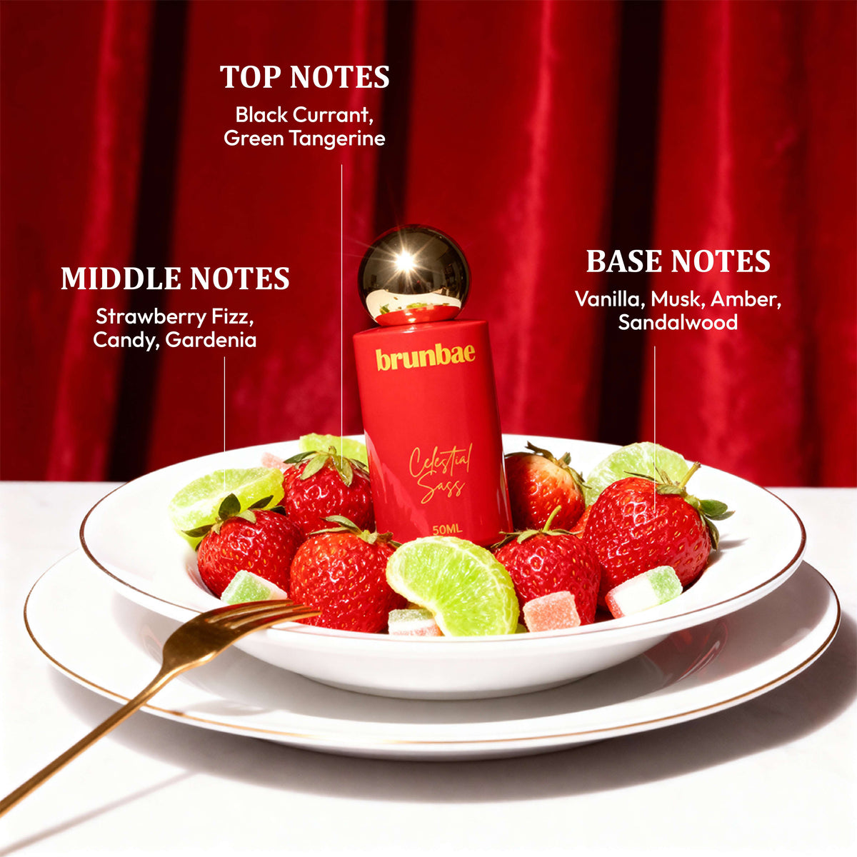 Strawberry fizz and candied whispers bloom with gardenia’s soft glow, creating a sweet rebellion wrapped in elegance. As the moment deepens, vanilla, musk, amber, and sandalwood melt into a warm, golden trail that lingers beautifully on hydrated skin.