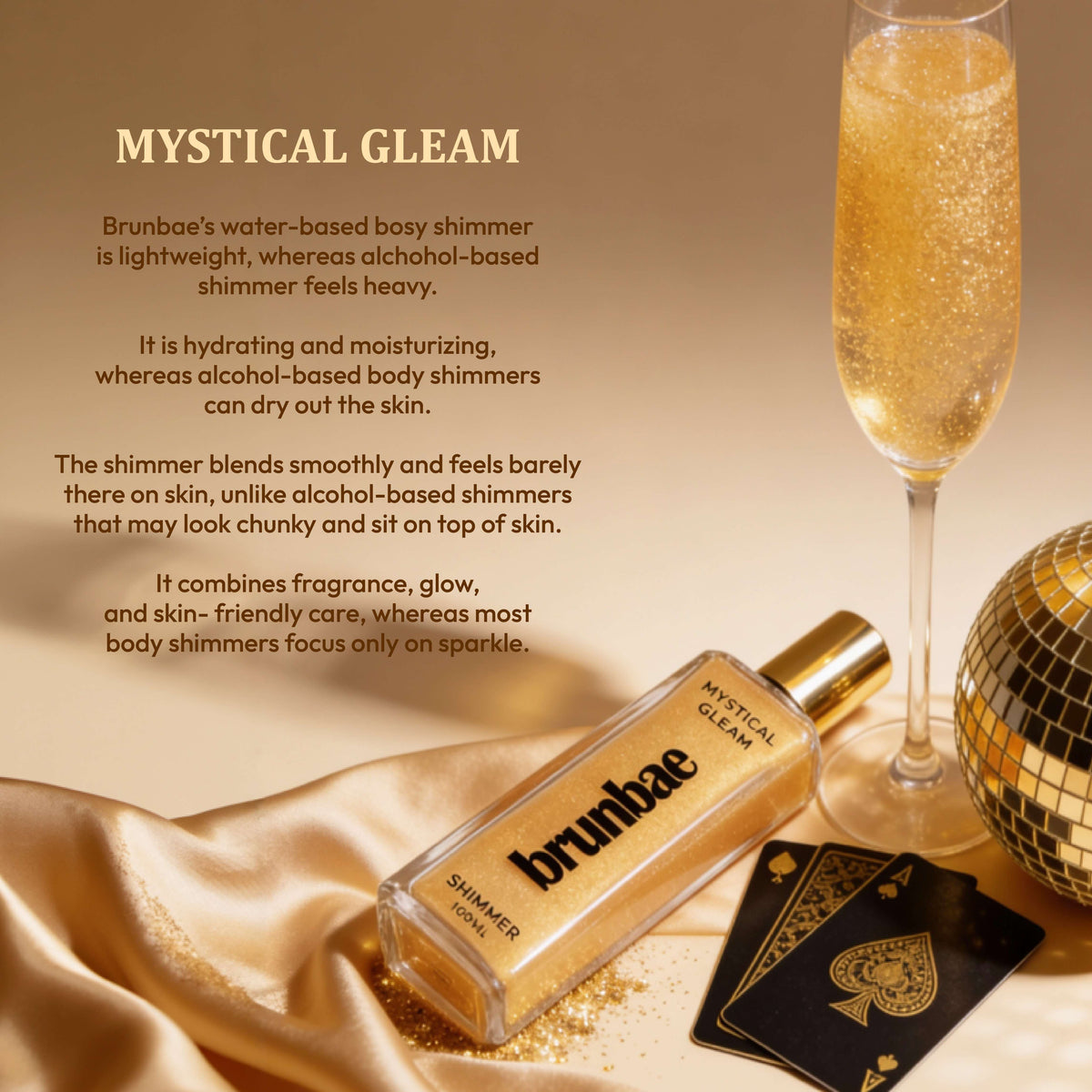 Mystical Gleam is a luxurious water-based shimmer mist that combines a captivating fragrance with a soft, radiant glow. Unlike alcohol-based mists, its gentle formula is non-drying, skin-safe, and irritation-free, making it perfect for all skin types even sensitive skin.